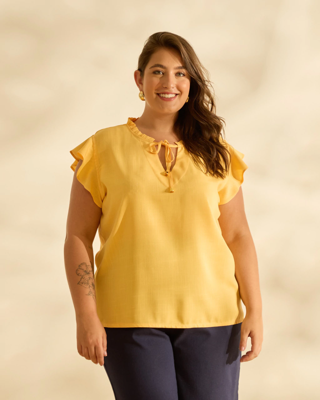 Delicada e feminina, essa blusa em viscose conquista pelo seu caimento leve e toque suave. O babado romântico no decote adiciona charme e sutileza, enquanto a amarração com ponteiras confere um detalhe especial e versátil ao look. Com mangas curtas fluídas, é perfeita para compor produções frescas e elegantes, acompanhando a rotina com conforto e um toque de sofisticação despretensiosa.